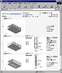 経路作成時に設定した工程情報と、モデル・使用工具・経路のイメージ図を含んだ加工指示書が、作成できるようになりました。出力結果は、HTML形式ですので、紙への印刷やネットワークを介して閲覧できるようになります。