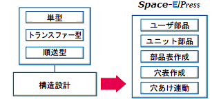 プレス型の工程設計は、Space-E/Press プレス工程設計向けの専用コマンドを用います。また、構造設計は、Space-E/Press 順送プレス金型設計向けのユーザ部品やユニット部品の機能を用います。(図1)