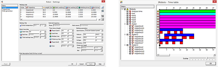 Simufact.weldingでは、複数のロボットを同時に稼働するような複雑な溶接工程も、各ロボットについて溶接パスの順番、溶接開始・終了時間、ロボットの停止時間などを、わかりやすい表を用いて管理・編集できます。また、全体の溶接スケジュールも、タイムテーブルを使って確認できます。